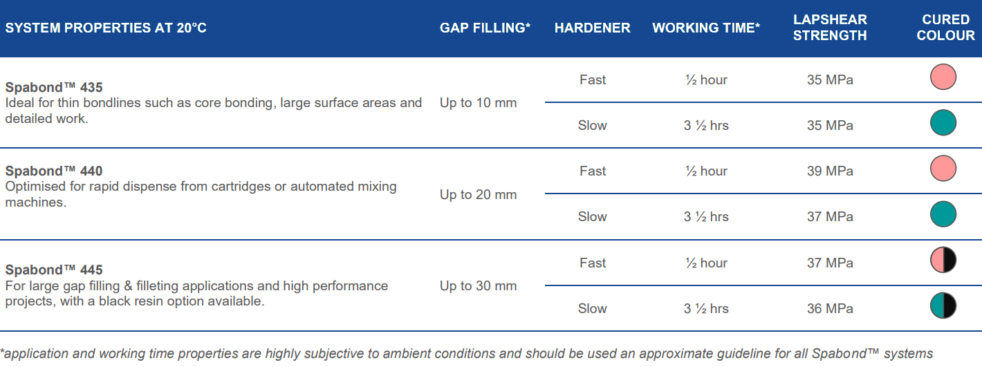 Spabond™ 400 Series only has 2 hardener speeds: Fast and Slow. These work with all 4 resin systems to reduce the number of products required, reducing waste and cost.